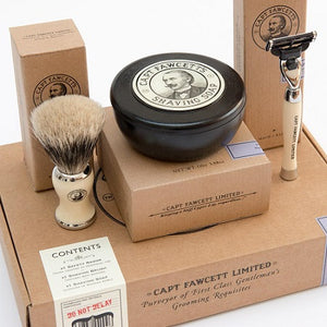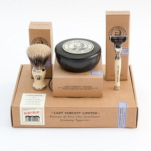 Captain Fawcett's Shaving Box Gift Set is a triad of vintage shaving extravagance. Included isCaptain Fawcett's Best Badger shaving brush, made with badger bristles