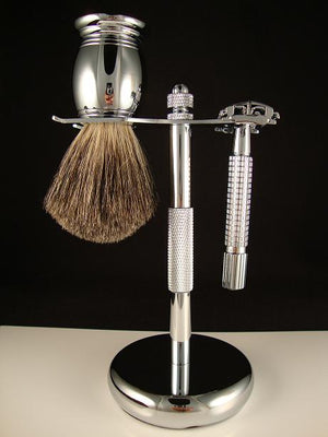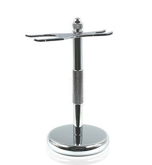 This stand holds a Double Edge Safety razor of most sizes and brands, along with a holder that fits most style's shaving brushes. Nickel plating keeps it rust free and has that look of class that will enhance the look of any restroom. It has a weighted bottom to ensure stability so rest assured that your prized investment will be safe.