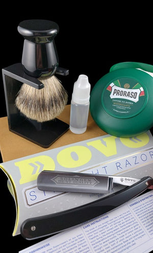 We  created this set to help simplify the task of getting started into the World of Straight Razor Shaving. Everything that was chosen is good quality products that will last a lifetime with care. The Dovo Best Quality 5/8 Full Hollow Ground Blade is a simple good quality razor from Germany, that is perfect for someone new to Straight Razor Shaving . The Scales are synthetic black two piece scales.  To shed some light for our clients with little to no razor knowledge, all Straight Razors from most other retailers do notcome professionally sharpened. What this means is, all Straight Razors come from the Factory with a basic factory edge which needs to be refined on water stones to make it "Shave Ready''. This is what sets The Classic Edge Shaving Store apart from other shaving stores in the world. We have a Honemeister on site that Professionally sharpens each and every Straight Razor to perfection, so that when you open the package, all you have to do is shave! No stropping is needed and we actually recommend that you do not strop the razor as we have already taken care of this for you. We also include a follow up sharpening ticket FREE of charge so when your razor is ready to be sent in for a day at the Spa. Please give us 2-3 days to sharpen the razor as they have to be sharpened by hand. If we can ship it out faster, we will do so. Thank you!"