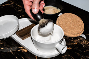 Shaving and aesthetics have always been connected. It is time to give your skincare the priority it deserves. With this set, you'll transform your shaving soap into nourishing lather and provide your bathroom with a handmade monument made of ceramic and wood. The tray, soap dish, lid and tray are all handmade for an aesthetic shaving experience without compromise. Since you love precision as much as we do, the milled out areas of wood and matte black glazed ceramic interlock with millimeter precision.
