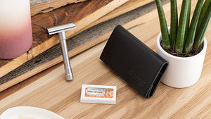 Do you also want to look dashing when travelling? Then you should take a look at the MERKUR 46C shaving set. The Model 46 is a small, lightweight safety razor that easily disassembles for quick transportation or storage. Simply stow it in the elegant space-saving leather case. Here you'll also find a package of razor blades for your journey!