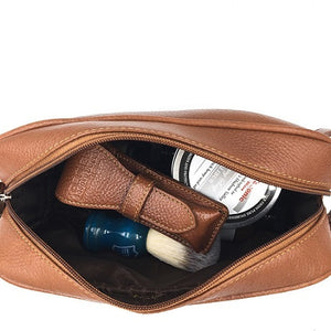 Our full-size saddle brown leather toiletry bag is the perfect travel companion. It will hold all your essentials while protecting them and the rest of your luggage. It is also handy for keeping your toiletry products in one place while at home.