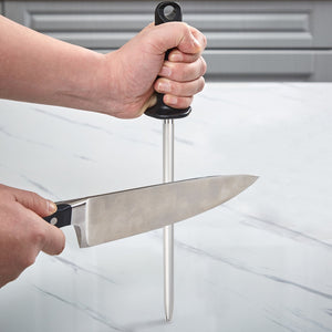 This Sharpal Sharpening Steel can hone and realign your knife edge quickly and easily. Unlike a knife “sharpener”, a honing steel is used by professionals after each use to roll the edge back to its original position and keep it at the ideal angle for maximum sharpness. It comes with an oversized hand guard for safety.