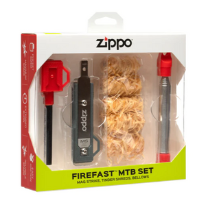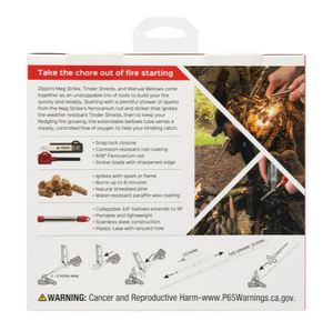 Whether you keep one with your camping gear or need it in a pinch, this Fire Starter Combo Kit has the essentials for any scenario. The Mag Strike ferrocerium rod and striker delivers a shower of sparks onto the quick-lighting and water-resistant tinder shreds (five included) for a strong for a hassle-free flame. Get your fire roaring with the collapsible manual bellows, which allows you to add just the right amount of air exactly where you need it. Comes packaged in a convenient, giftable carton.