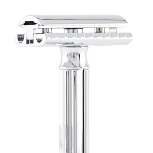 The head of the safety razor is manufactured using the zinc die-casting process since it creates instruments with maximum precision even for complex shapes. In order to ensure a comfortable weight distribution, we only use brass for the handle. The chrome finish protects the razor from corrosion and underlines the high-quality design.