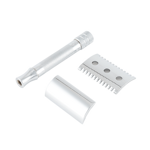The Merkur 15C razor is a three-piece safety razor consisting of a top plate, comb, and handle. The teeth of the comb guide the hair to the razor blade ensuring a very thorough wet shave. Another advantage of the tooth comb is that it is difficult to clog with cut hair. Choose this model if you want to remove thicker and longer facial and body hair.