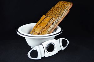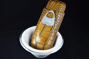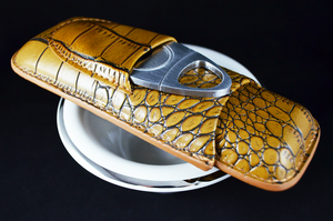 This gorgeous yellow-brown finished, faux-alligator leather cigar case will elegantly hold up to two of your favourite premium cigars! It's telescopic design allows you to fully accommodate even your longest cigars.