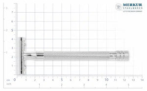 • 1 Merkur DE Razor with bright chrome finish and straight-cut closed comb