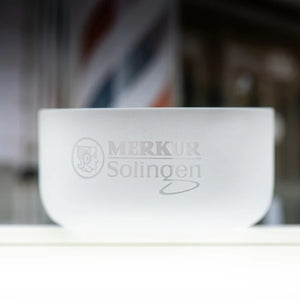 MERKUR Shaving Bowl, handy and decorative with a diameter of 85mm. With the Glassmaker pipe, the Glass gets taken out from the oven and inflated in a wooden mold. In the process, the pipe is always rotated. After cutting, the whole thing goes into cooling, then the bottom and the edges are sanded, the logo is glued on and the outer surfaces are sandblasted.