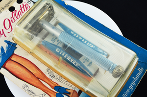 Here is the pinnacle of Shaving Collectibles for women.  Gillette Blue Starburst is just what it looks like, pure eye candy that shaves as well as any gentleman's shaver of the time.  Long Handle for better reach when shaving the lower legs near the ankle's.  It's not hard to find a vintage blue starburst, but this New Old Stock is another matter completely.  An excellent piece for any collection.   Condition is unpacked and the razor is like the day it was sent out to sell. Packaging has signs of wear and light yellowing of the out plastic.