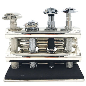 This Parker heavyweight chrome plated razor caddy will hold four standard size safety razors. It is made from solid brass with a mirror chrome finish and includes a padding on the base that is washable. Why not store your razors in this attractive and well built stand that will protect them for years of use?