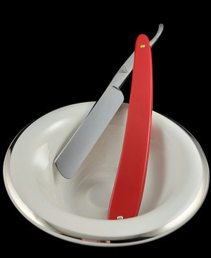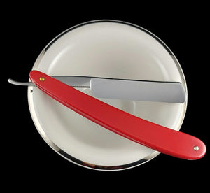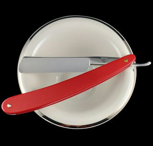 Originating from Poland around 1950, these quarter hollow ground 5/8 straight razors are New Old Stock and provide a superior shave. They are simple to hone if you prefer to maintain them yourself. The original scales have been replaced with Dovo red plastic, and the blade has been polished to remove signs of age. Being New Old Stock, the razor has never been sharpened or used. It performs exceptionally well and, as with all razors from The Classic Edge Shaving Store, it is delivered professionally honed with a complimentary follow-up honing included.