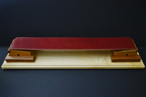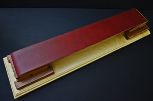 Your strop has a tiger base maple base, with walnut used for the guides and leather gripper bars. The anchor blocks and slides are made from cherry and the leather strop itself is made from top grade English Bridle. All of the hardware is solid brass with the exception of the screws which tighten the leather gripper bars; here I have chosen steel because brass screws would not be strong enough to take the side loads involved.