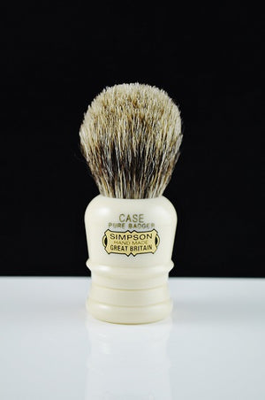 Simpsons shaving brushes are filled with 100% badger hair which is sorted, dressed, and sterilized by a London firm whose origins date back to the 16th Century. Badger hair has been used for more than two centuries to make the finest traditional English shaving brushes. This handmade Case C1 is filled with Pure Badger Hair that has a soft darker creamy tip and is housed in a lathe-turned imitation ivory handle. Pure badger hair is flexible and have superior quality which will provide many years of faithful service as well as going a long way to helping you achieve the perfect shave. This brush will exfoliate the skin and lift and soften the beard prior to shaving.